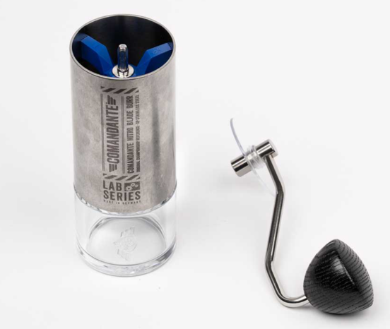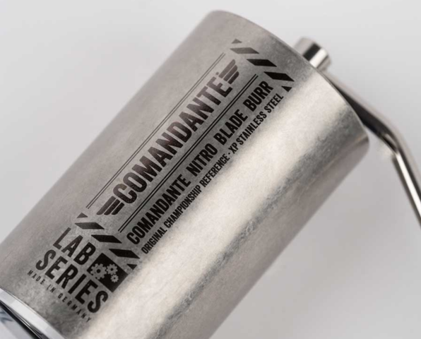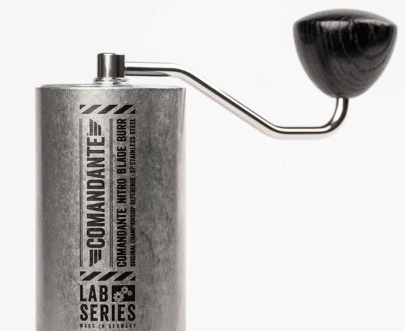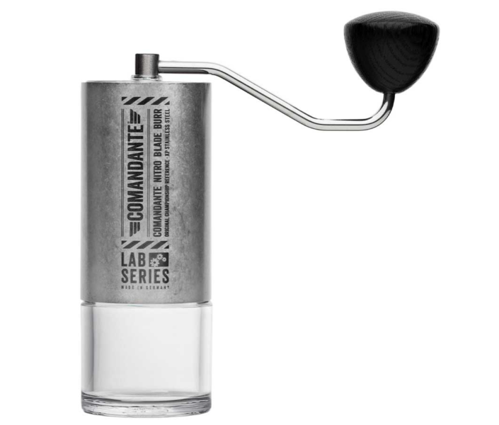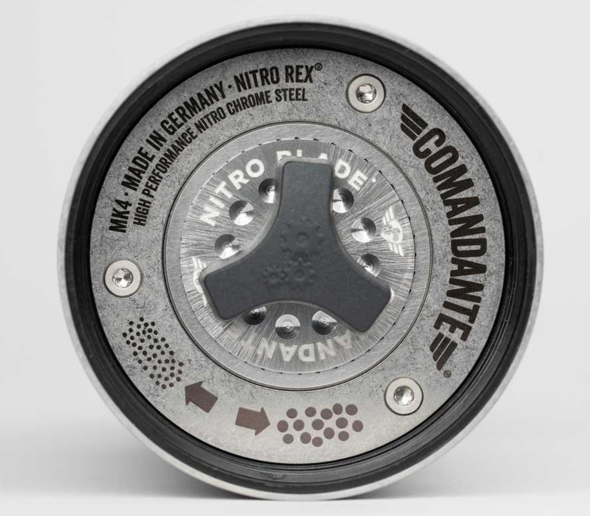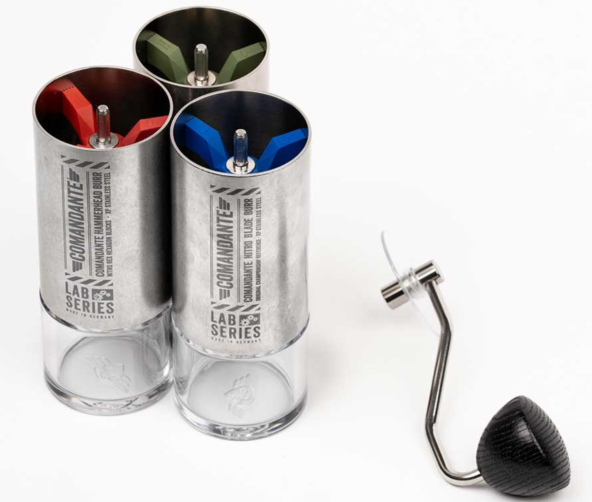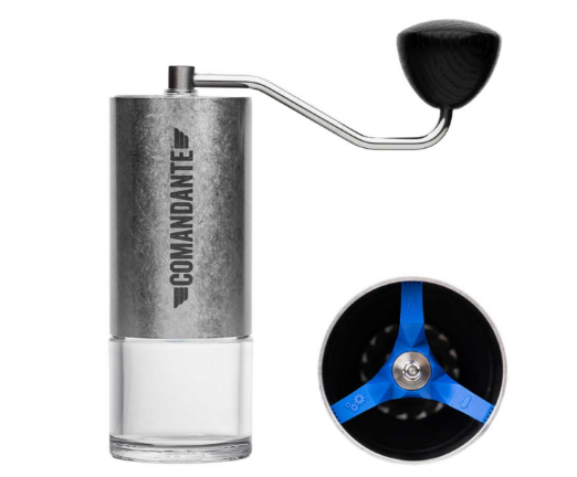 Привычная кофемолка Comandante C40 в цвете Stone Washed. С жерновами Nitro Blade, но изготовленными из новой стали Nitro Rex.