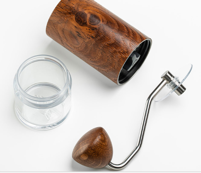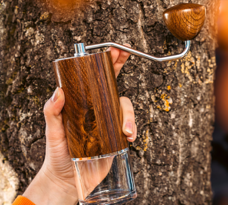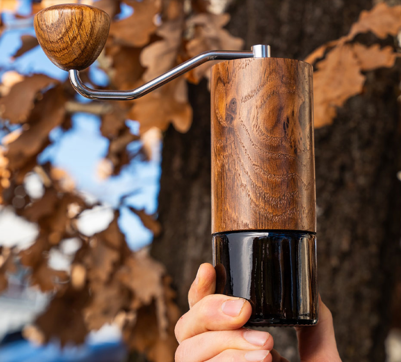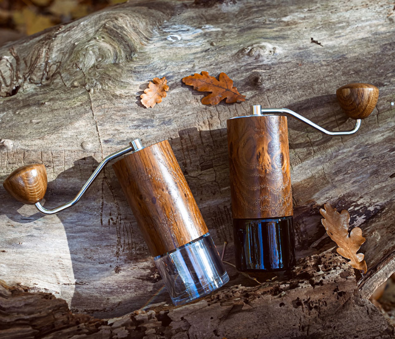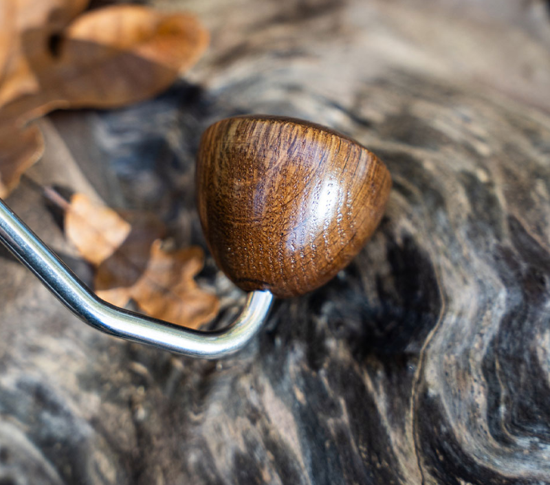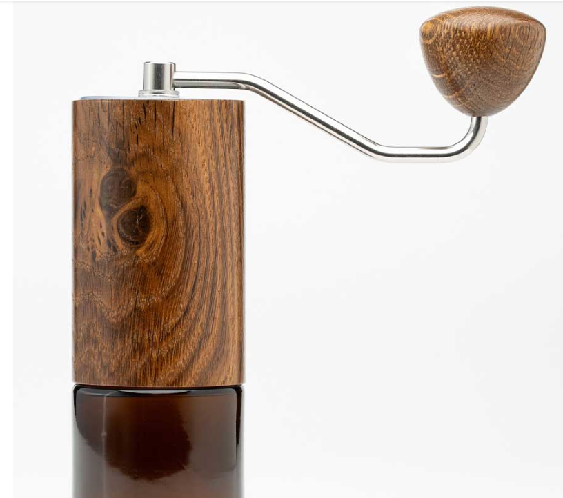 Легендарная ручная кофемолка Comandante С40, цвет - яркий коричневый с коньячным отливом. Натуральный шпон cучкового, свиливатого дуба. Отделка натуральным воском с льняным маслом.
